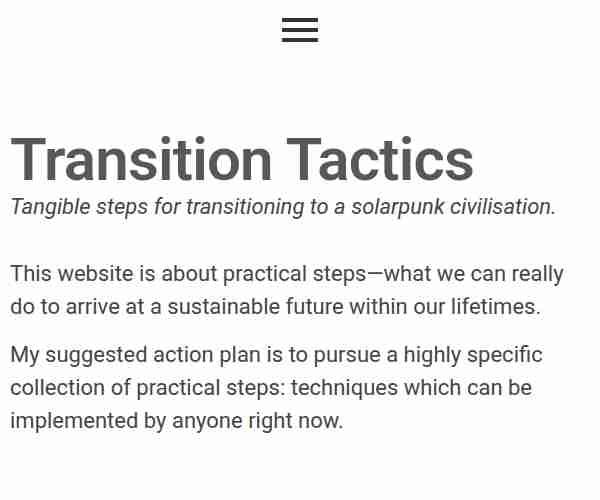 Tangible steps for transitioning to a solarpunk world. Practical tactics for a solarpunk civilisation right now.