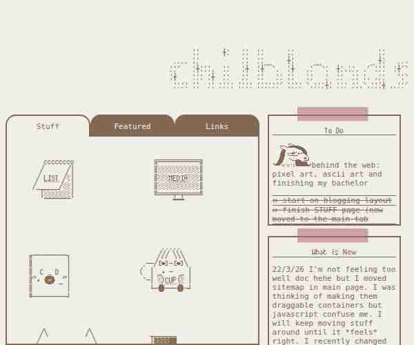 A personal (mostly) static website with a retro aesthetic dedicated to my art and projects. Also hosts my blog, video games, and IRL arts and crafts.