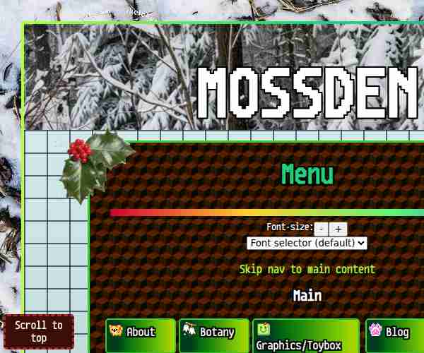 The homepage of Mossyfool's neocities site MossDen, hosting the page directory, sitemap, general about and extras.