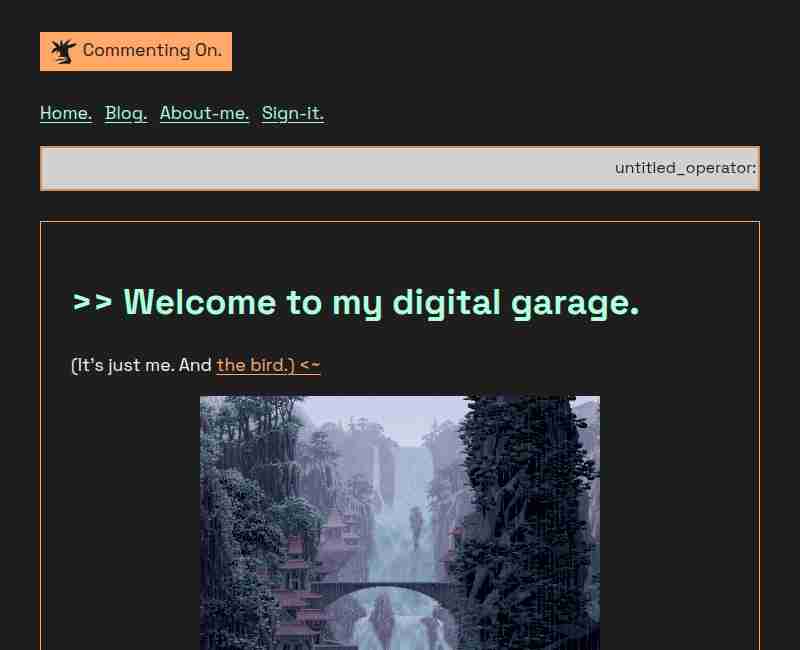 Welcome to my digital garage. (It’s just me. And the bird.) <~ 400x400-waterfall-gif \>\> I’ve been here in my dreams. I’m just a guy wit...